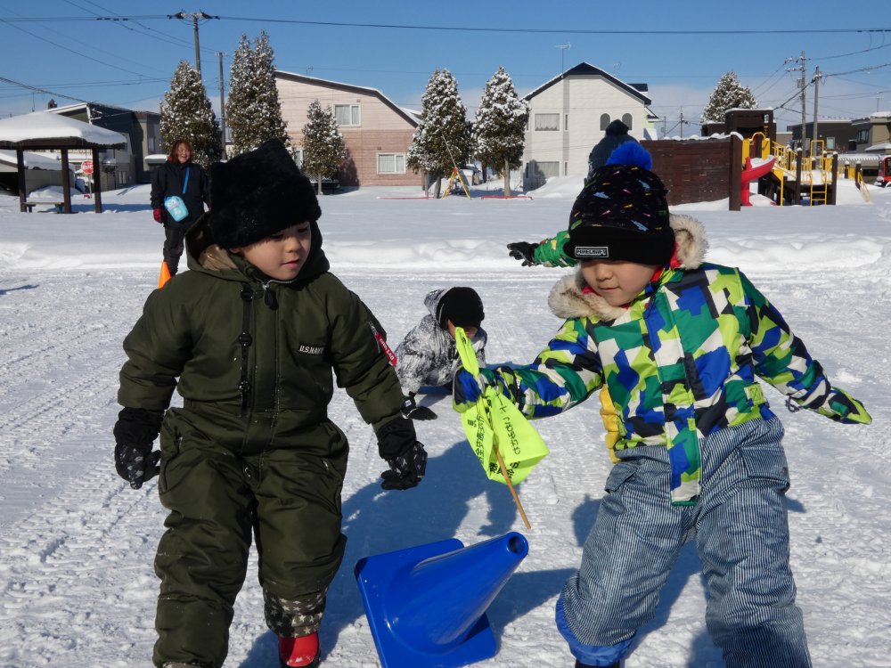 種目はスノーフラッグ、そり引っ張りリレー、宝(みかん)探しです。